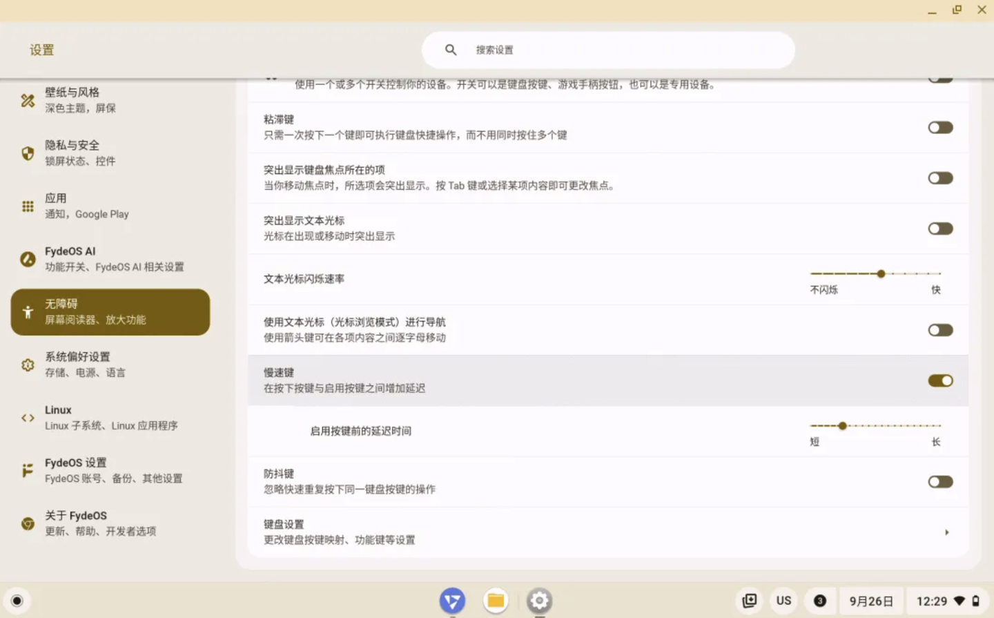 「防抖键」 可以防止单次按键被系统误判为多次重复输入,对有手部震颤的用户尤其有帮助。「慢速键」 则在按键按下和字符上屏之间引入一个延迟,以减少因意外触碰按键导致的输入错误。