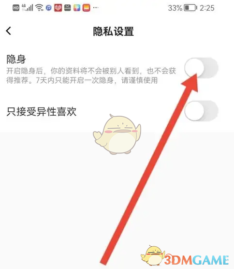 4、来到隐私设置,然后把【隐身】的按钮开启。