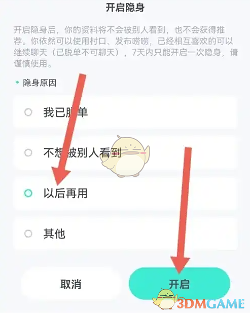 5、弹出下面的界面,然后选择隐身原因,再点击【开启】即可。