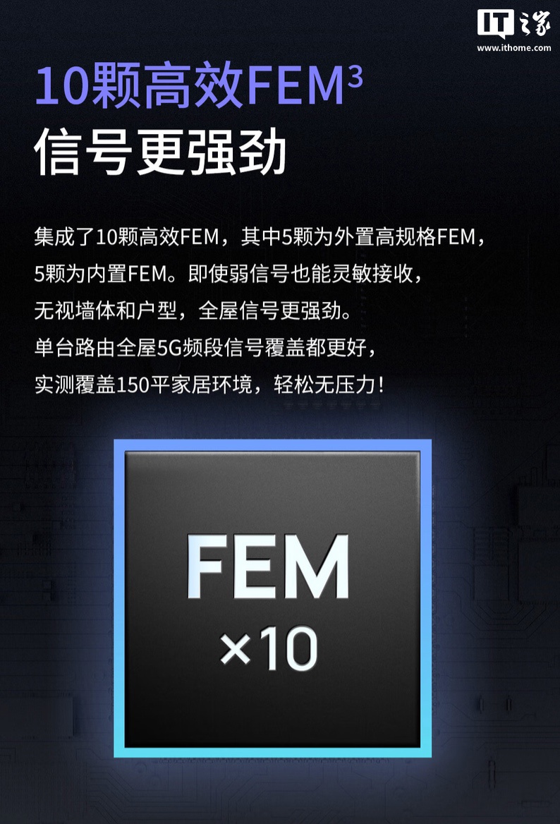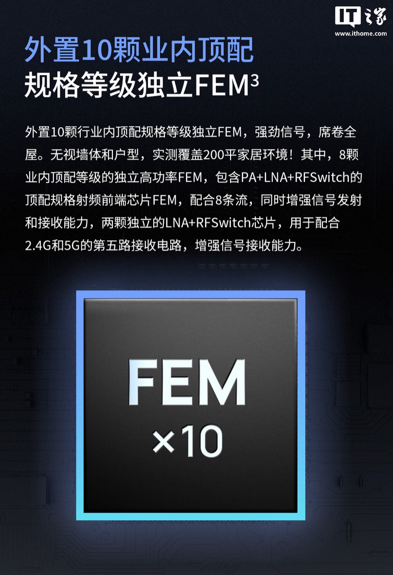 具体来说,7DR7270 采用 5 颗外置独立 FEM(alixixi注:4 颗 PA+ LNA + RF Switch 和 1 颗 LNA + RF Switch)、5 颗内置 FEM,匹配双 2.5G 口 + 四千兆口。