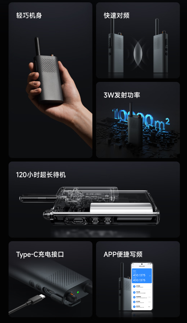 其他方面,新品可通过小米对讲机 App 或米家 App 插件,对设备快速写频、配置管理。通过机身按键、旋钮与语音反馈,可以快速完成各项功能设置。机身采用 PC+ABS 材质,机身坚固防滑。