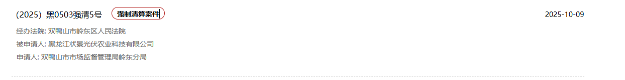 全国企业破产重组信息网显示,黑龙江双鸭山市岭东区人民法院已启动对黑龙江状景光伏农业科技有限公司进行强制清算,申请人为双鸭山市市场监督管理局岭东分局,案号(2025)黑0503强清5号,公开时间为2025年10月9日。