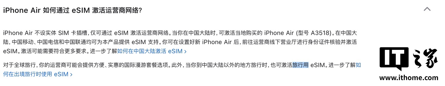 alixixi提醒:暂不知悉国行 iPhone Air 是否长期可用海外 eSIM、是否在内地可用海外 eSIM 漫游,应等待首发测试。
