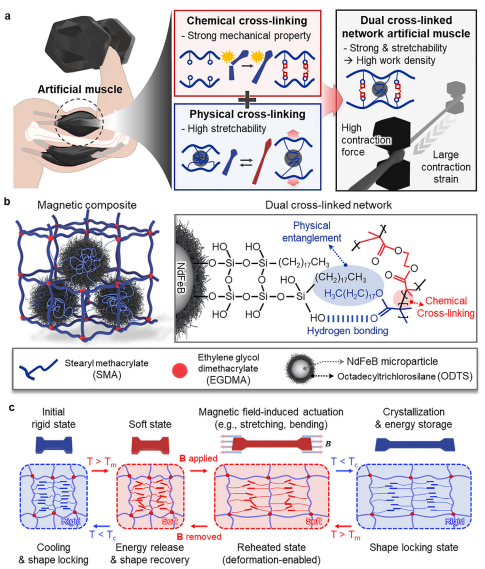 此外,研究人员还在材料中加入了经特殊表面处理的磁化颗粒,以增强物理键的作用,并使人工肌肉能够在外部磁场控制下运动。在实验中,团队已成功利用磁场让人工肌肉实现抓取动作。