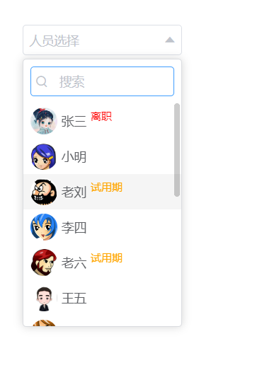 <template> <div> <vxe-select v-model="val1" placeholder="人员选择" :options="opts1" :option-config="{height: 40}" multiple filterable clearable> <template #option="{ option }"> <div class="user-select-item"> <img :src="option.url" class="user-select-img" /> <span class="user-select-name"> <span>{{ option.label }}</span> <span v-if="option.status" :class="['user-select-status', option.status]">{{ getUserStatus(option.status) }}</span> </span> </div> </template> </vxe-select> </div></template><script setup>import { ref } from 'vue'const val1 = ref()const opts1 = ref([ { label: '张三', value: '1', status: 'dimission', url: 'https://vxeui.com/resource/avatarImg/avatar1.jpeg' }, { label: '小明', value: '2', status: '', url: 'https://vxeui.com/resource/avatarImg/avatar2.jpeg' }, { label: '老刘', value: '3', status: 'trial', url: 'https://vxeui.com/resource/avatarImg/avatar3.jpeg' }, { label: '李四', value: '4', status: '', url: 'https://vxeui.com/resource/avatarImg/avatar4.jpeg' }, { label: '老六', value: '5', status: 'trial', url: 'https://vxeui.com/resource/avatarImg/avatar5.jpeg' }, { label: '王五', value: '6', status: '', url: 'https://vxeui.com/resource/avatarImg/avatar6.jpeg' }, { label: '小陈', value: '7', status: '', url: 'https://vxeui.com/resource/avatarImg/avatar7.jpeg' }, { label: '老徐', value: '8', status: 'dimission', url: 'https://vxeui.com/resource/avatarImg/avatar8.jpeg' }, { label: '小瑞', value: '9', status: '', url: 'https://vxeui.com/resource/avatarImg/avatar9.jpeg' }, { label: '小马', value: '10', status: '', url: 'https://vxeui.com/resource/avatarImg/avatar10.jpeg' }, { label: '小徐', value: '11', status: 'trial', url: 'https://vxeui.com/resource/avatarImg/avatar11.jpeg' }, { label: '小三', value: '12', status: 'dimission', url: 'https://vxeui.com/resource/avatarImg/avatar12.jpeg' }, { label: '老李', value: '13', status: '', url: 'https://vxeui.com/resource/avatarImg/avatar13.jpeg' }, { label: '小四', value: '14', status: '', url: 'https://vxeui.com/resource/avatarImg/avatar14.jpeg' }, { label: '小李', value: '15', status: 'trial', url: 'https://vxeui.com/resource/avatarImg/avatar15.jpeg' }])const getUserStatus = (status) => { switch (status) { case 'dimission': return '离职' case 'trial': return '试用期' } return ''}</script><style lang="scss" scoped>.user-select-item { position: relative; height: 40px; display: flex; flex-direction: row; align-items: center;}.user-select-img { width: 30px; height: 30px; border-radius: 50%;}.user-select-name { padding-left: 5px;}.user-select-status { font-size: 12px; position: absolute; top: 0; padding-left: 5px; &.dimission { color: red; } &.trial { color: orange; }}</style>