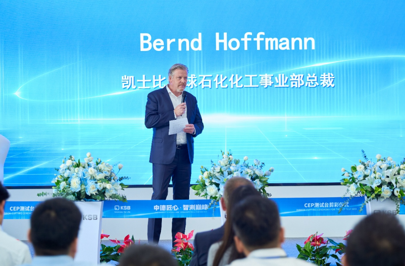 Mr. Bernd Hoffmann则代表总部对上海市及闵行区政府长期以来的支持表示感谢。回顾2023年,化工工程泵工厂的建成离不开多方支持,并且也是凯士比近年来最大的单笔投资项目,建筑面积1万平方米,总投资约1.3亿元。他表示,“CEP 智能测试台不止是‘效率工具’,更是‘客户协作桥梁’—— 客户不用千里迢迢来现场,通过数字孪生就能实时看测试数据,就像给泵做‘远程体检’,既省心又能精准把控质量。智能测试台的核心,是用‘数字孪生’连起技术与客户 —— 既提效率,更让信任看得见,这是化工领域可持续合作的关键。该工厂是凯士比践行本地化、数字化与可持续发展战略的典范,具备绿色、智能的双重优势。”