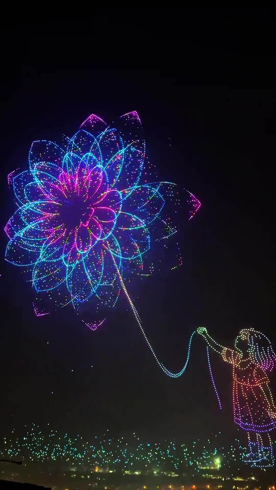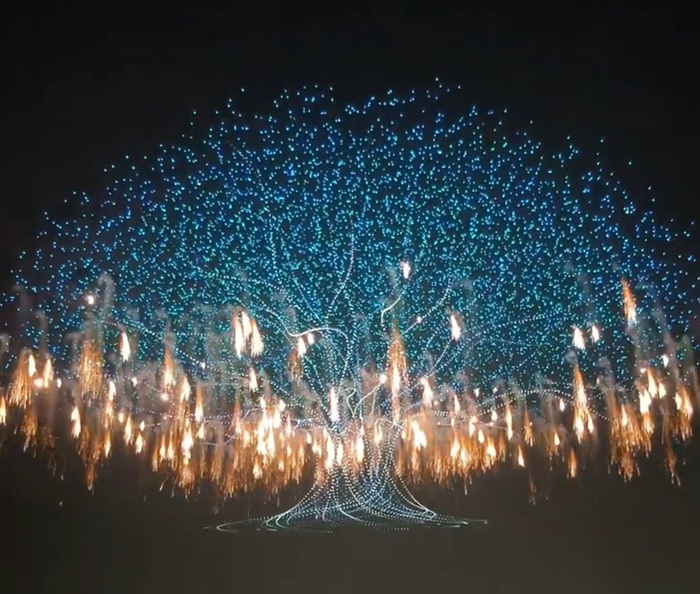 据alixixi了解,表演分为日景与夜景两场。白天,无人机与烟花组合呈现“DNA”结构演化为“种子”再绽放为“繁花”的生态主题;夜晚则演绎“天空之树”奇观,近 1.6 万架无人机组成巨树轮廓,金色烟花如瀑布般从“树冠”倾泻而下,营造出“火树银花”的视觉盛宴。