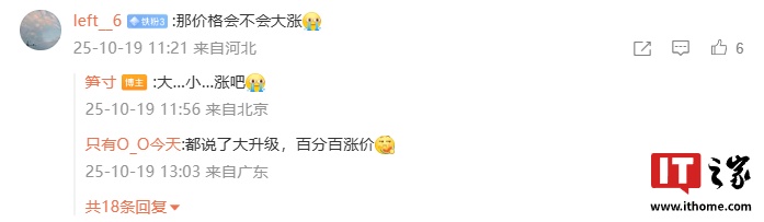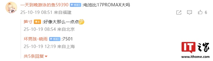 alixixi注意到,有用户询问新机价格会不会大涨,笋寸表示“大... 小... 涨吧”。另外,还有用户询问 REDMI K90 Pro Max 的电池容量是否比小米 17 Pro Max 大,笋寸回复“好像大那么一点点”,这也意味着 REDMI K90 Pro Max 的电池容量将大于 7500mAh。