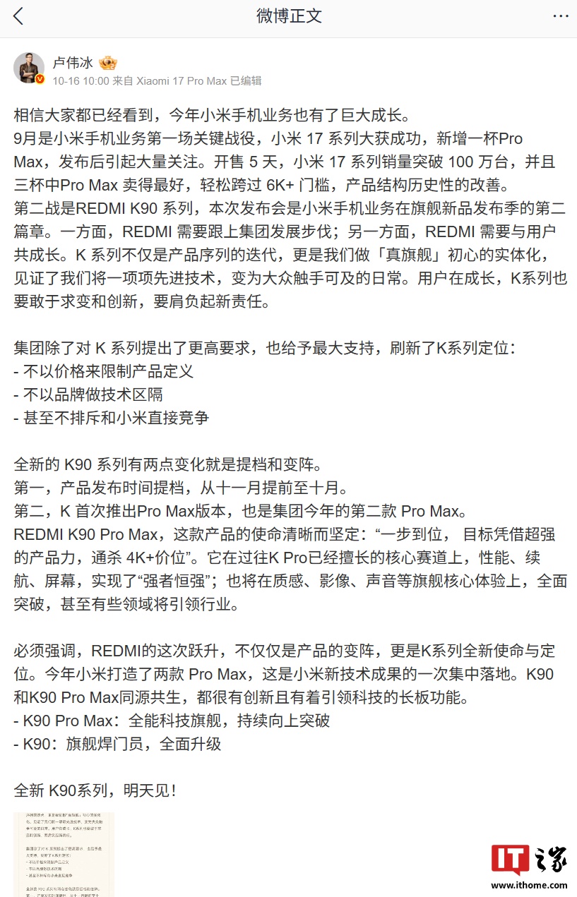 alixixi 10 月 19 日消息,10 月 17 日上午,REDMI 红米手机官微宣布,REDMI K90 Pro Max 定档 10 月 23 日 19 时正式亮相,新机号称“为追求极致而来”“为挑战巅峰而生”“为不负期待而战”,是 REDMI 史上第一款 Pro Max 机型。