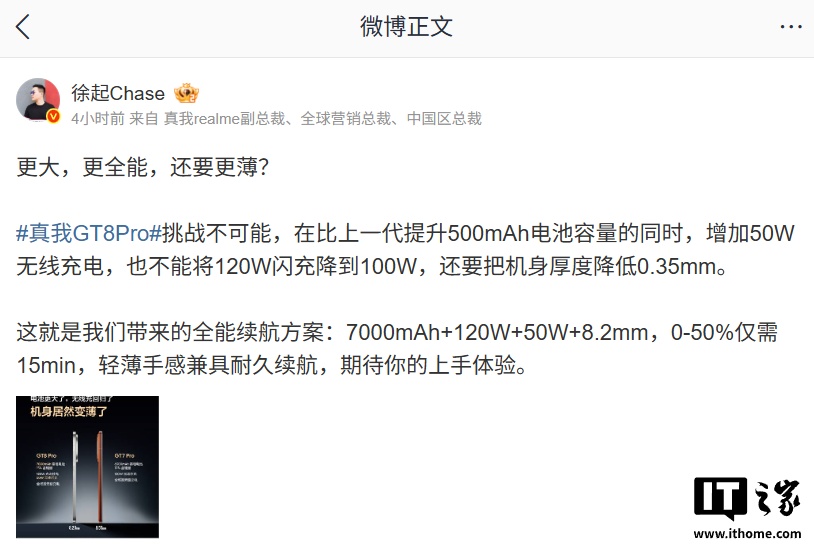 alixixi 10 月 19 日消息,realme 真我手机官方今日正持续预热 GT8 Pro 新机。据介绍,真我 GT8 Pro 比上代电量更足,内置 7000mAh 泰坦电池(提升 500mAh),在电池容量提升的基础上,该机还将其厚度减薄 0.35mm。