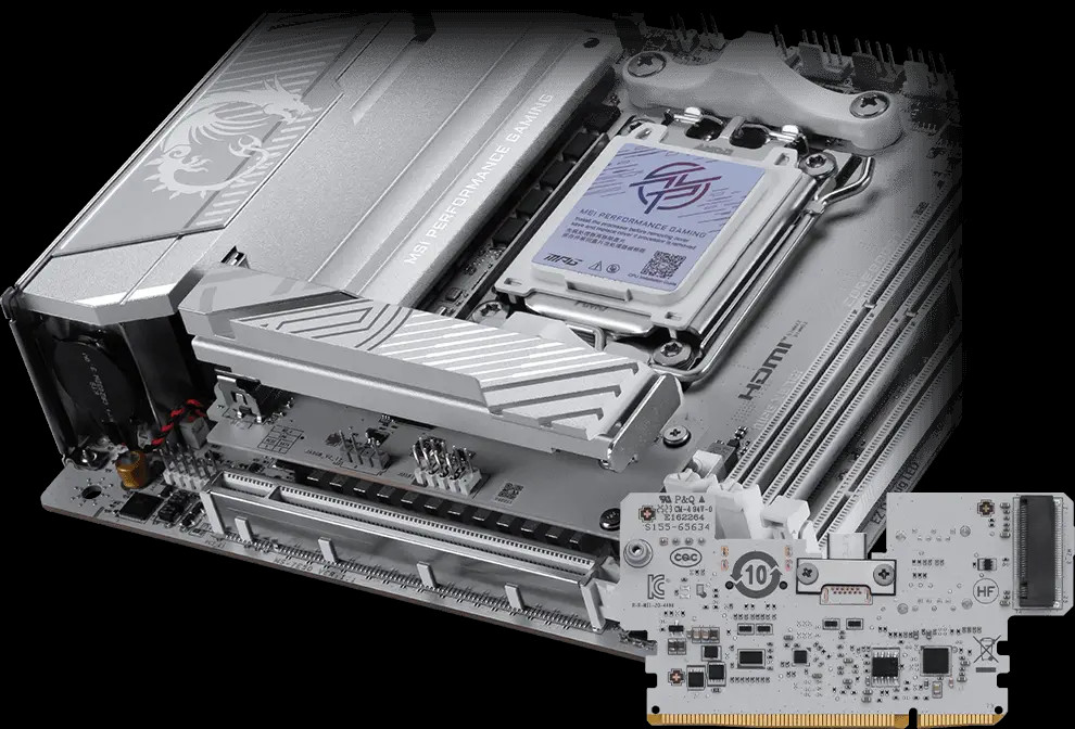 与此前英特尔 800 系平台上的 MPG Z890I EDGE TI WIFI 类似,这款 AM5 ITX 新品也在主 PCIe 插槽上方和内存插槽右侧设有两组子卡结构。