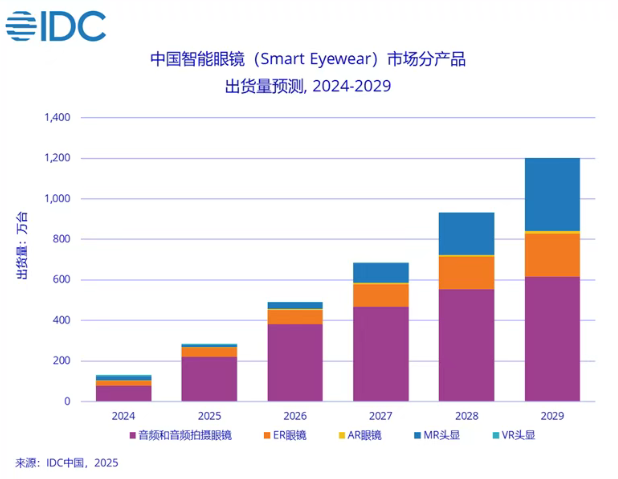 alixixi 10 月 20 日消息,IDC 今日发布报告,2025 上半年,全球智能眼镜市场出货量达 406.5 万台,同比增长 64.2%。IDC 预计,到 2029 年,全球智能眼镜市场出货量将突破 4000 万台,其中中国市场份额将稳步提升,预计五年复合增长率(2024-2029)将达到 55.6%,增速位居全球首位。