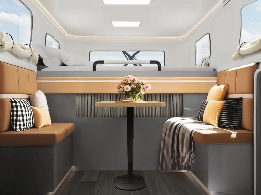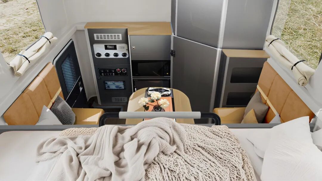 该车车内配有固定额头床(1800×1850mm),可选加宽额头床(2055×1850mm),还支持卡座变床(760×2000mm),额头窗内空高度超 0.9 米。车内独立卫浴空间 0.85㎡,功能分区明确,还配有全电厨房系统,内置电磁炉、微波炉、大容量冰箱,支持外置柴油灶选装。该车还可选装 3.2 米电动遮阳棚,一键展开即成“户外客厅”。