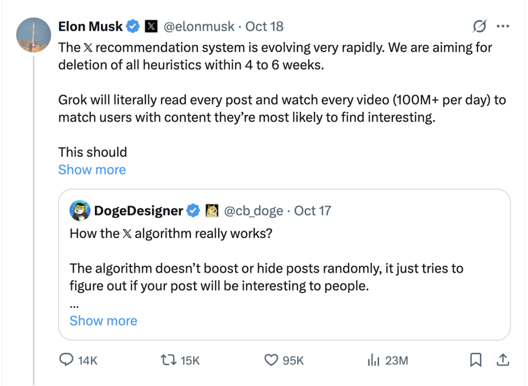 随后,马斯克在二级转发中透露了 X 推流算法的新进展:全面将启发式算法升级,由 Grok 接管 AI 推送。而且,用户还可以对 Grok 提出请求,从而动态调整内容推荐,让其更个性化。