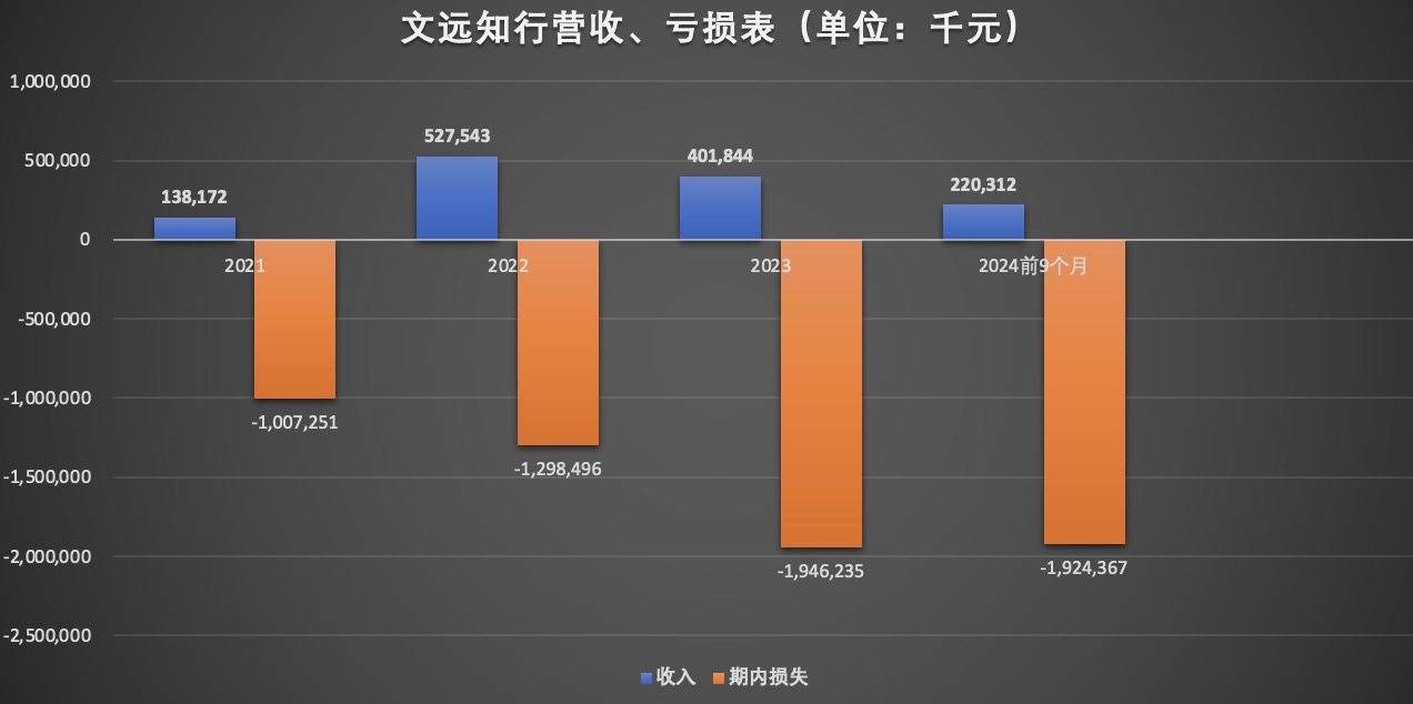 文远知行自成立以来,一直处于亏损状态,且亏损持续扩大。2021-2023年以及2024年前三个季度,该公司分别产生10.07亿元、12.99亿元和19.46亿元、19.24亿元的亏损,累计亏损61.76亿元。