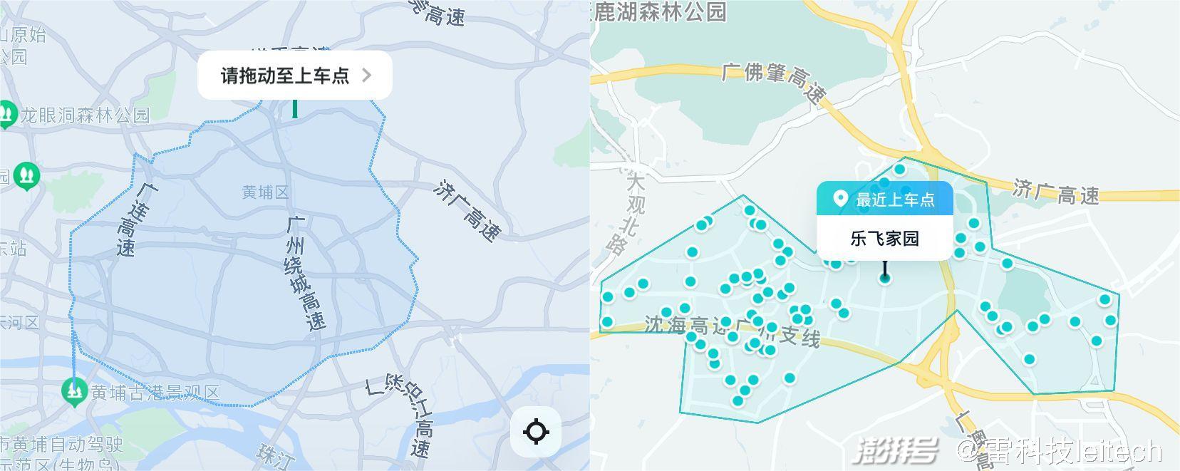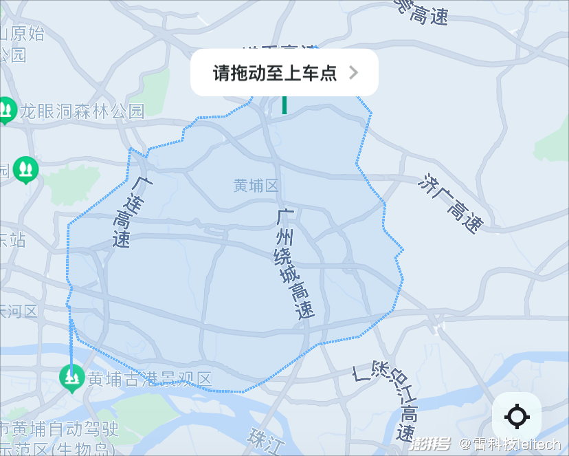 萝卜快跑在广州的试运营区域主要为广州黄埔区,同时也覆盖了天河区的部分区域。因此,当我们打开萝卜快跑App时,只能在地图显示的蓝色区域内呼叫车辆。乍一看,区域范围貌似还挺大的,但许多区域压根没法选定乘车点,边缘区域尤为明显。用户只能在地图提供的固定乘车点之间进行选择,自由度远不如网约车。