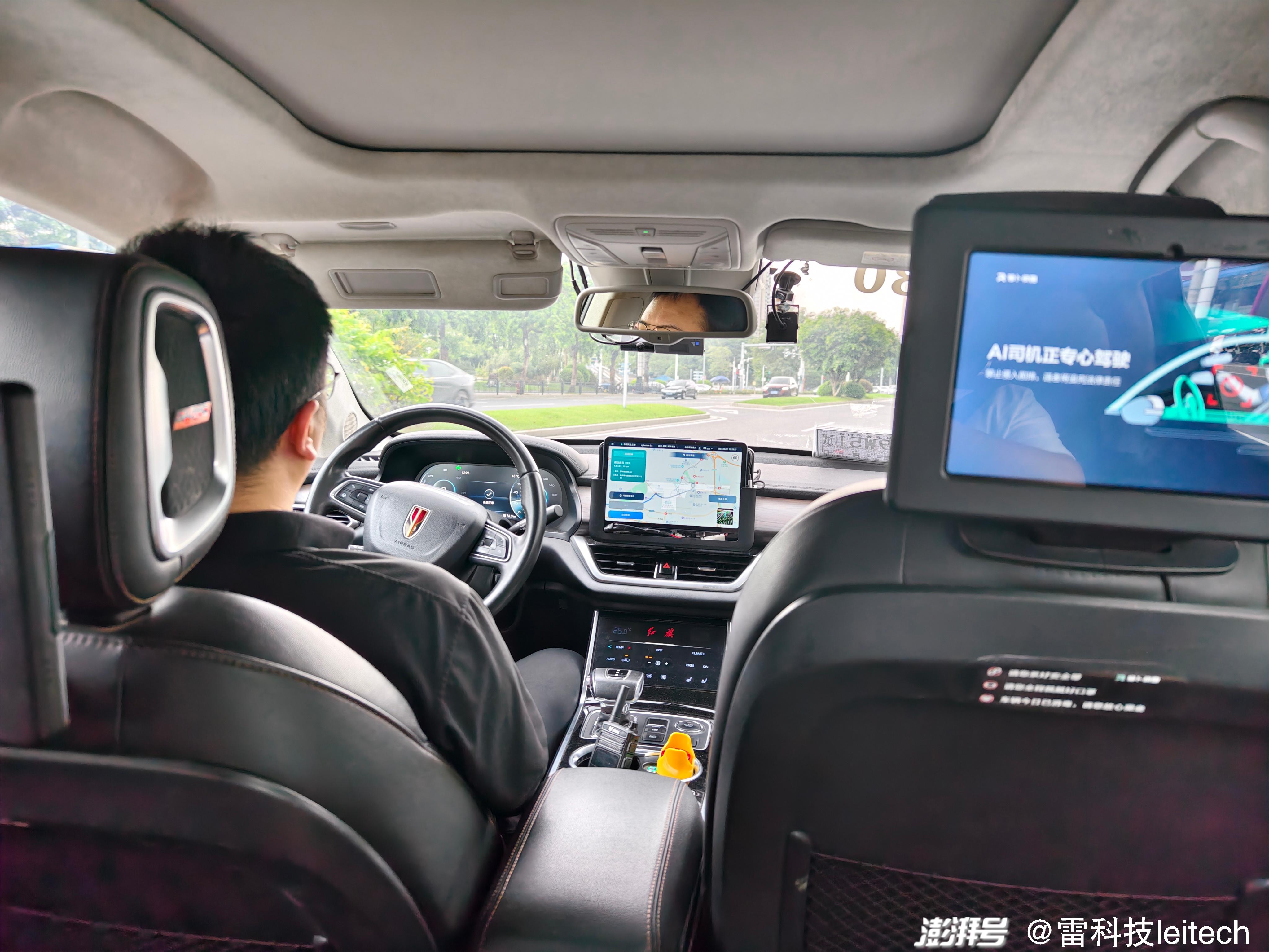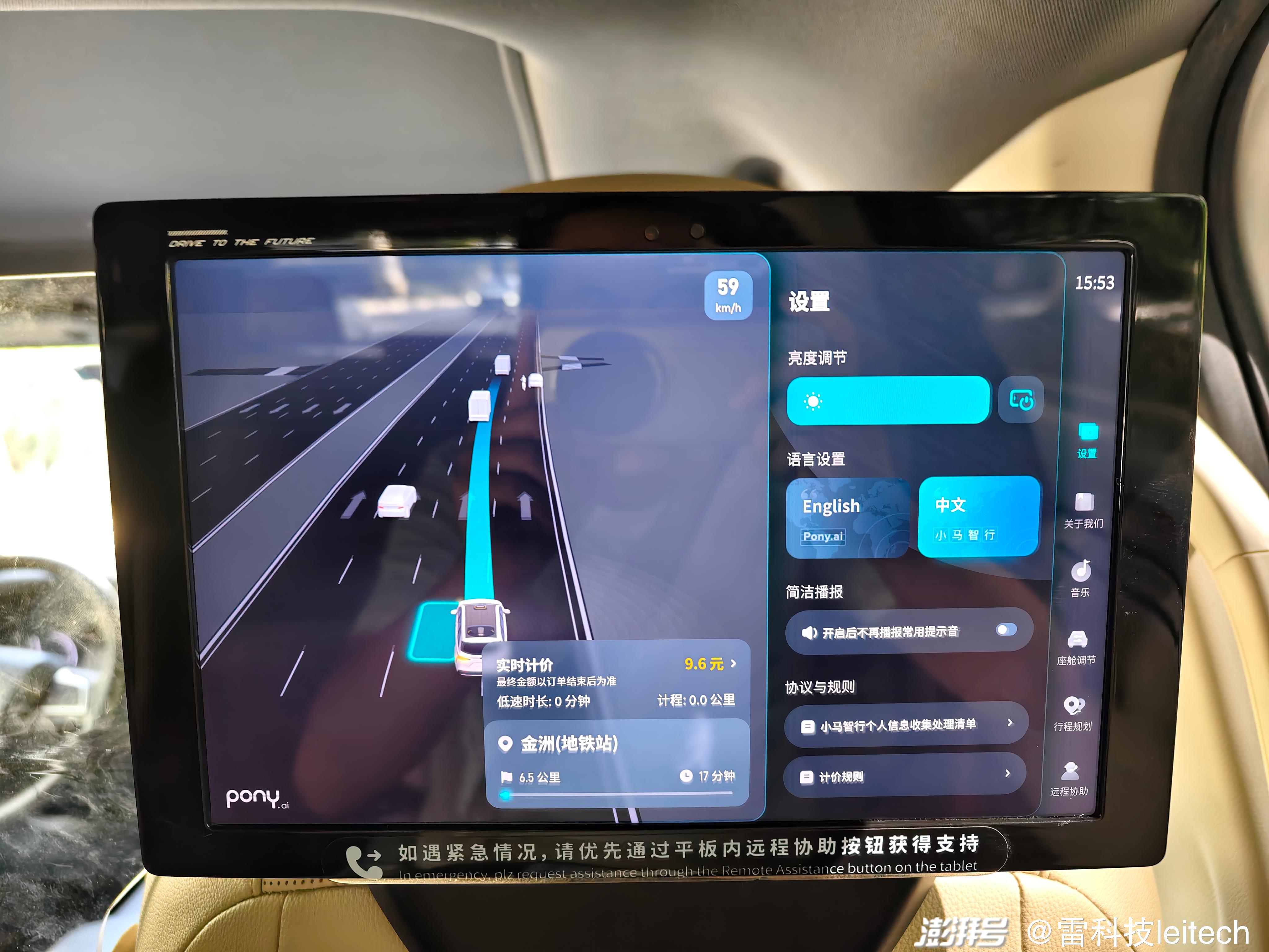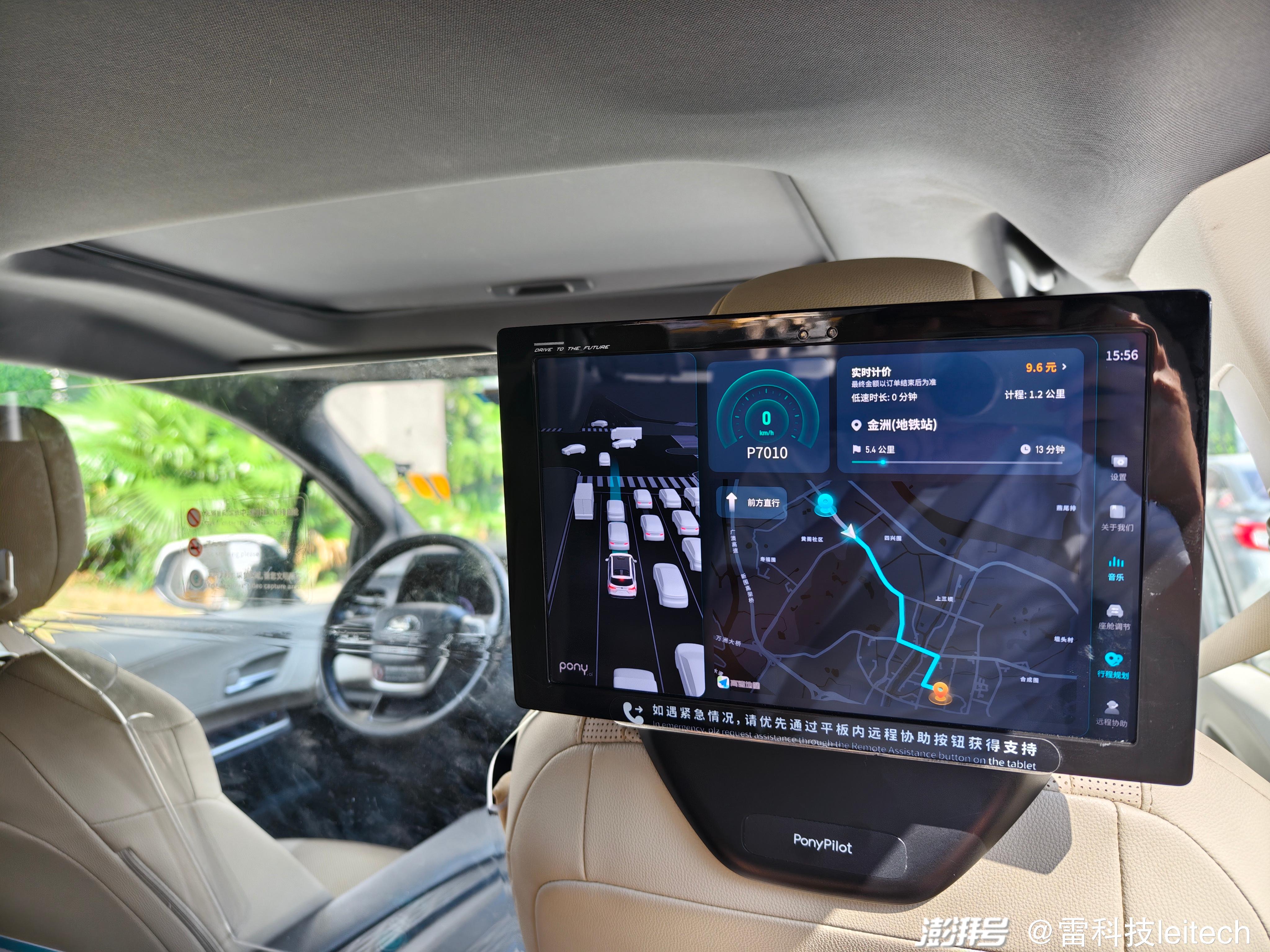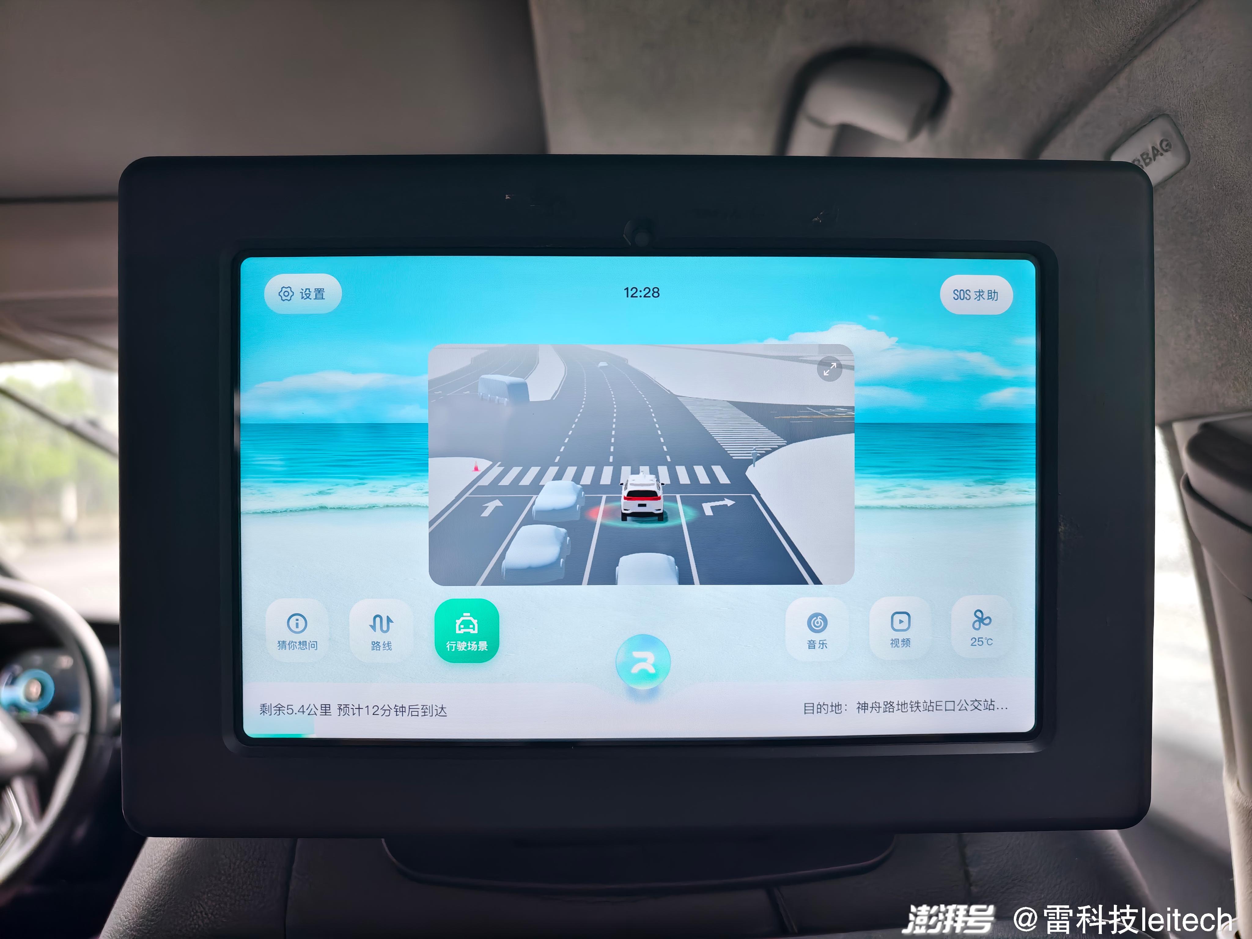 车内驾驶位坐有一名安全员,副驾驶位则不能落座,因此理论上只能乘坐3个人。上车后,安全员会口头提醒乘客系好安全带和确认手机尾号,车后排有两个显示面板,乘客可进行音乐、视频、空调温度、路线、联系客服以及行驶场景等操作。操作体验怎么说呢,小雷只能评价为比飞机显示屏稍微流畅些,但也能顺利实现各种功能。