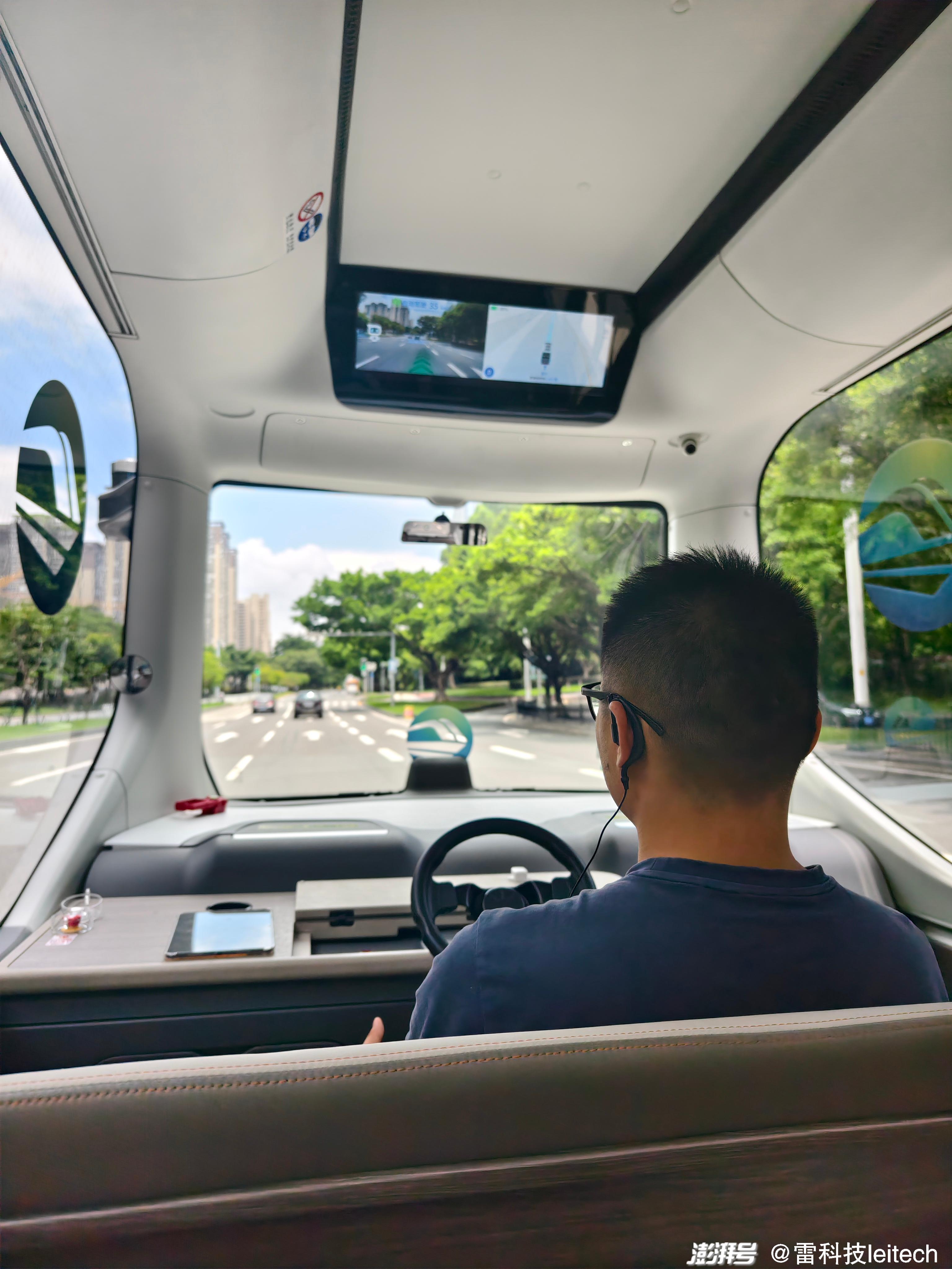 车内前排坐着一位安全员,后面两排座位合计可以坐6个人。安全员身前只有一个方向盘。坐在小雷的角度,是完全看不到仪表盘之类设备的存在,乘客可以通过上方显示屏查看车辆时速和驾驶场景。上车后,安全员会主动提醒系好安全带,稍微等待一段时间如果没有人上车的话,车辆就会关门出发。