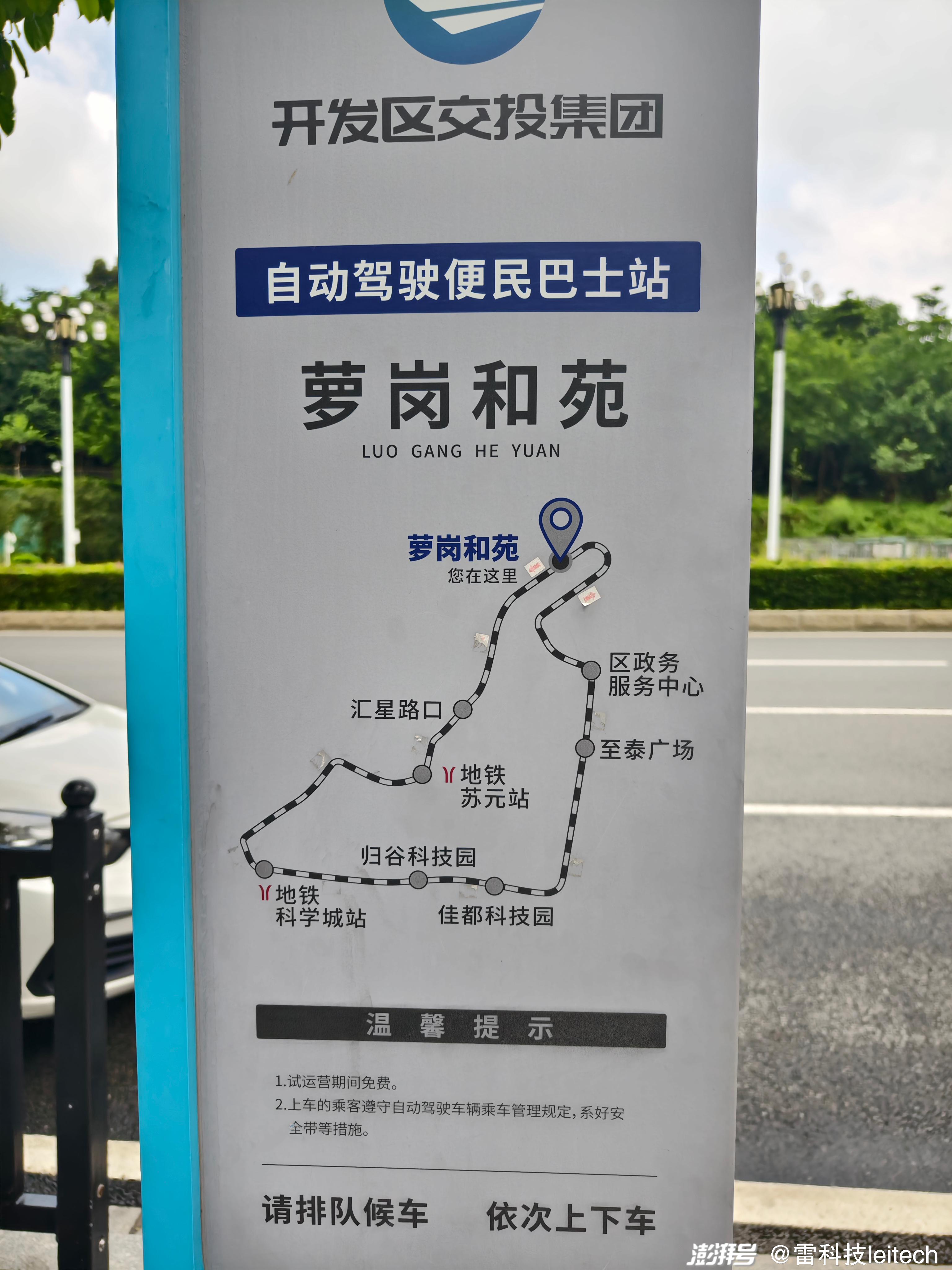 小雷从地铁科学城站坐到了萝岗和苑,全程4.5公里24分钟到达。尽管通行效率不高,但个人认为乘坐体验要比无人驾驶出租车好上许多,座位舒适度是一方面,更重要的是可以慢慢欣赏路边景色。该路线试运营期间是免费的,如果未来能面向更多区域开放,即使收费,小雷认为也值得一试。