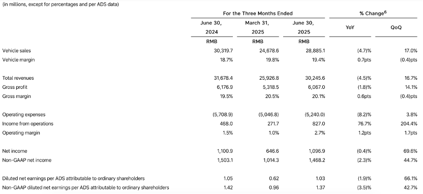 8月28日,理想汽车(Nasdaq:LI;02015.HK)公布的2025年第二季度财报显示,公司第二季度营收实现302.46亿元,同比下滑4.5%,较一季度增长16.7%;季度净利润为10.97亿元,与去年同期的11亿元几乎持平,较一季度增长69.6%。截至二季度末,公司现金储备高达1069亿元,在手资金充沛。