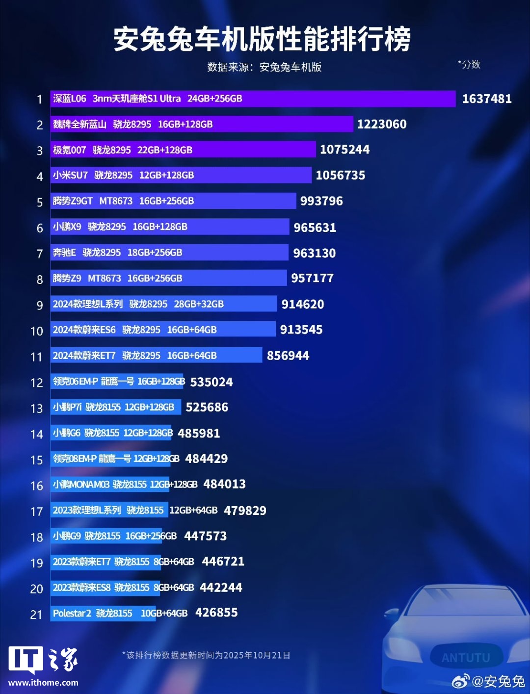 安兔兔车机性能排行榜(数据更新时间为 2025 年 10 月 21 日)显示:魏牌全新蓝山搭载骁龙 8295 芯片,辅以 16GB+128GB 规格,排名第二;极氪 007 搭载骁龙 8295 芯片,辅以 22GB+128GB 规格,排名第三;小米 SU7 搭载骁龙 8295 芯片,辅以 12GB+128GB 规格,排名第四;腾势 Z9 GT 搭载 MT8673 芯片,辅以 16GB+256GB 规格,排名第五。