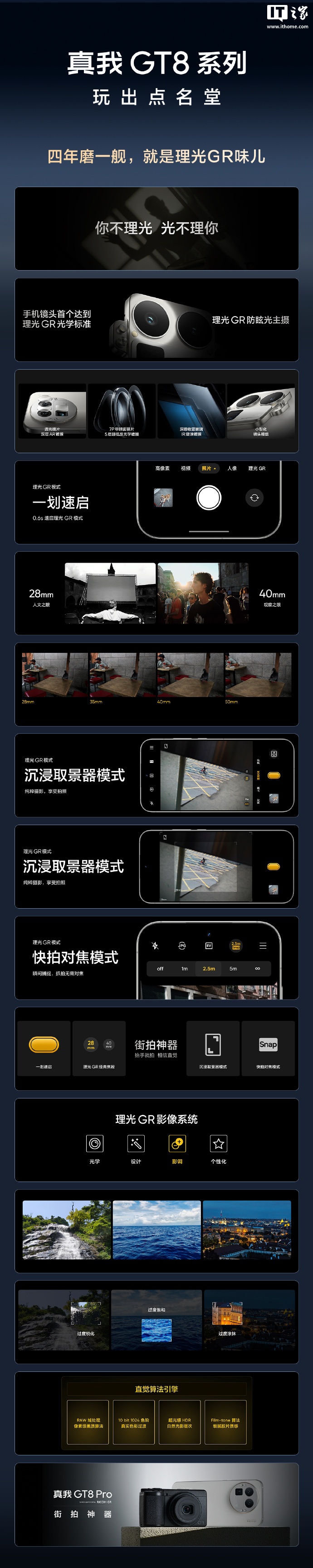影像方面,真我 GT8 Pro 带来定制化理光 GR 相机模式,支持人文之眼「28mm」+ 观察之眼「40mm」经典焦段、沉浸式取景器模式、快拍对焦模式等,适配理光 GR 五大经典胶片影调:高对比黑白、正片、负片、标准、单色。