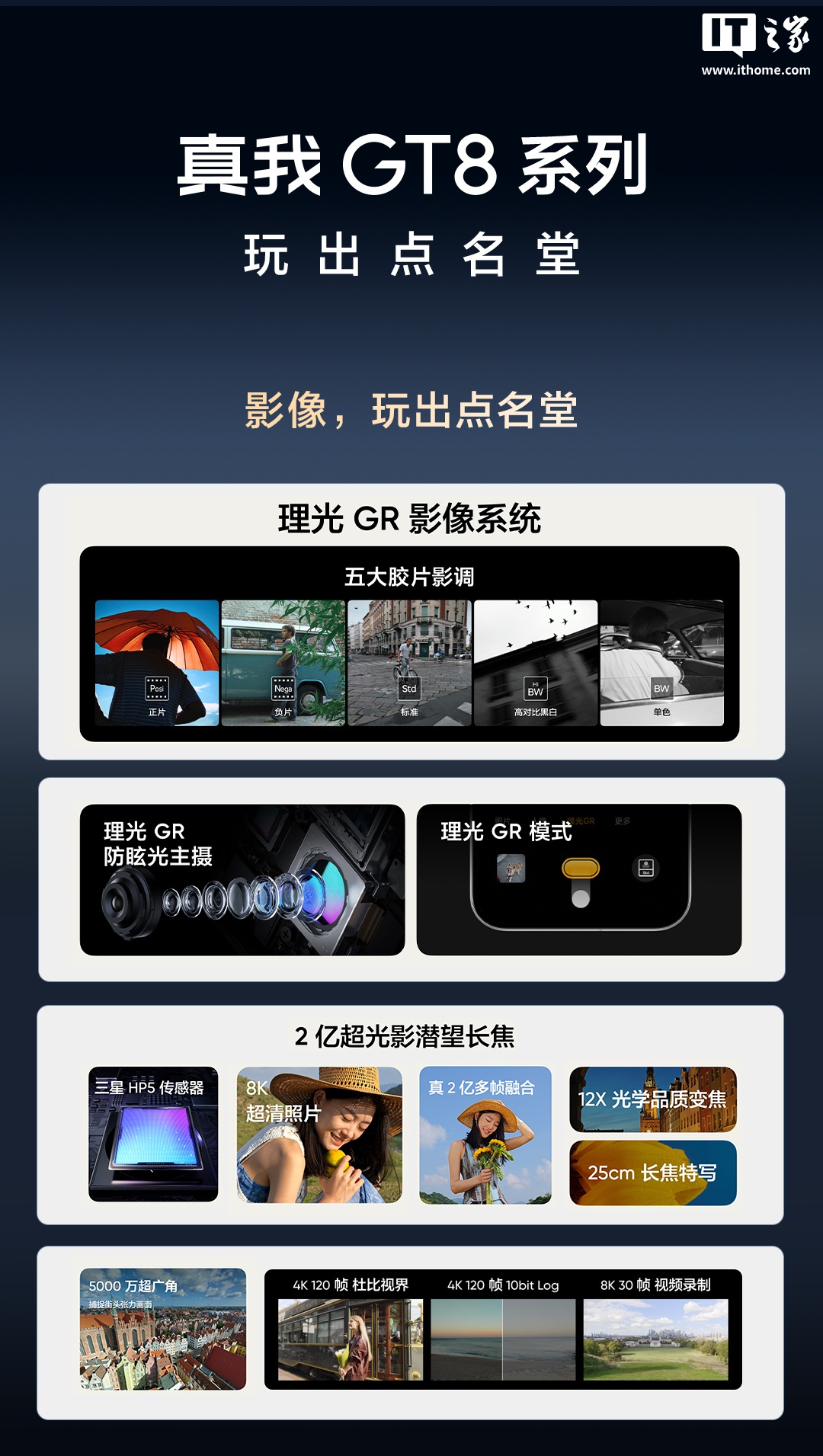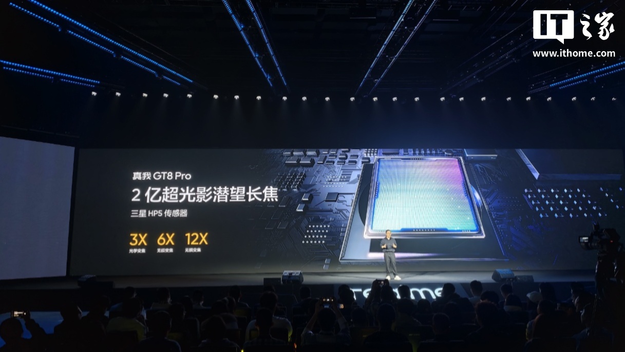 真我 GT8 Pro 搭载 2 亿超光影潜望长焦(三星 HP5 传感器),在全新骁龙芯片和真我算法加持下实现多帧融合,支持 8K 超清照片 1x、3x 默认直出,还带来 3 倍光学变焦、6 倍无损变焦、25cm 长焦特写。新机还搭载 5000 万像素超广角,支持 116° 的黄金视角。