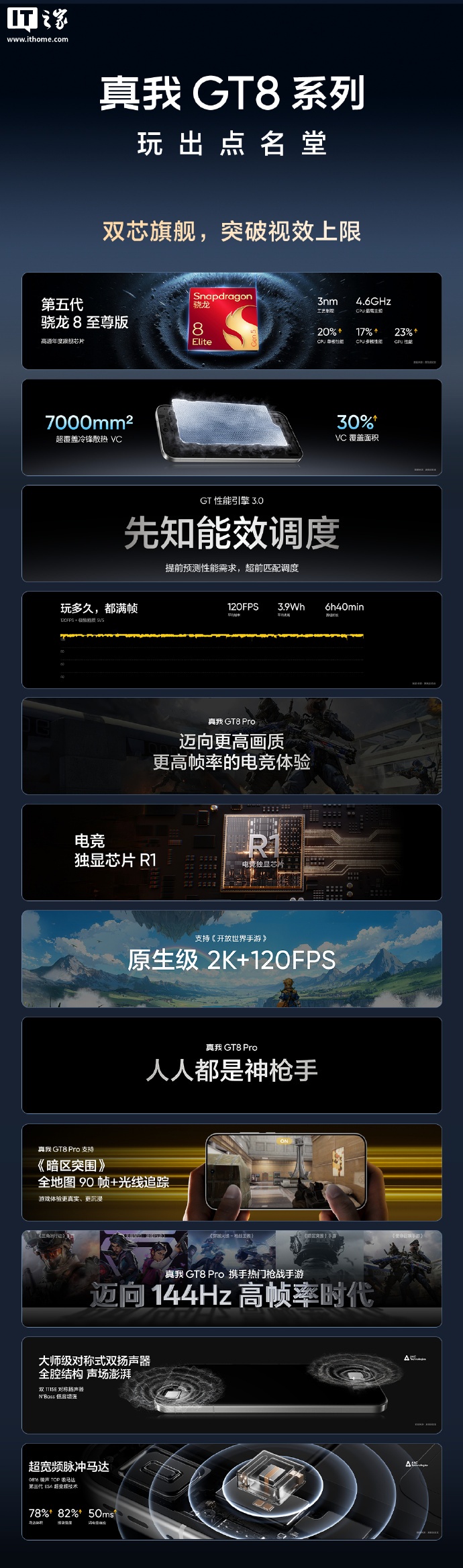 性能方面,新机搭载第五代骁龙 8 至尊版处理器,采用高通自研 Oryon 架构,第二代 3nm 制程工艺打造。搭配电竞独显芯片 R1,支持超百款游戏超帧超分;GT 性能引擎超前匹配调度,支持《开放世界手游》原生级 2K+120FPS;7000mm² 超覆盖冷锋散热 VC,真我历代机型最大 VC,覆盖面积相比上代提升 30%。此外,该机还配备双 1115E 对称扬声器、0816 瑞声 TOP 级马达。