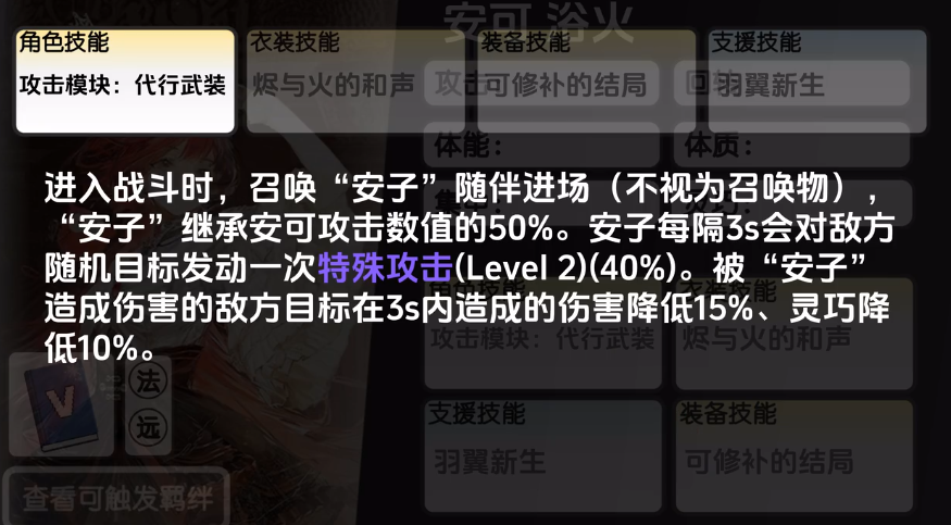 角色技能叫做代行武装,进入战斗时,召唤安子随伴进场,这里的安子是不视为召唤物的,出现的小红鸡就是安子,也是安可本体小红鸡,继承安可攻击数值的50%,所以安子每隔3s会对敌方随机目标发动一次特殊攻击,效果达到40%,被安子造成伤害的敌方目标在3s内造成的伤害降低15%、灵巧降低10%。