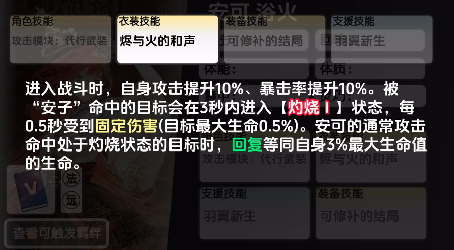 衣装技能叫做烬与火的和声,进入战斗时,自身攻击提升10%、暴击率提升10%,被安子命中的目标会在3秒内进入【灼烧1】状态,每0.5秒受到固定伤害,也就是目标最大生命0.5%的数值,此时安可的通常攻击命中处于灼烧状态的目标时还可以,回复等同自身3%最大生命值的生命。