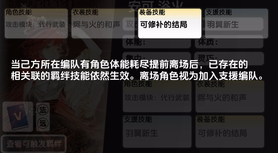 安可的装备技能叫做可修补的结局,当己方所在编队当中有角色的体能耗尽,并且导致提前离场后,此时已存在的相关联的羁绊技能还是依然生效的,而此时离场角色视为加入支援编队,这个装备效果是比较适配于安可的能力,带来的持续支援效果很明显,当然后期大家也可以根据安可需要的战场能力来进行调换,这里的装备技能一般都是挑选的。