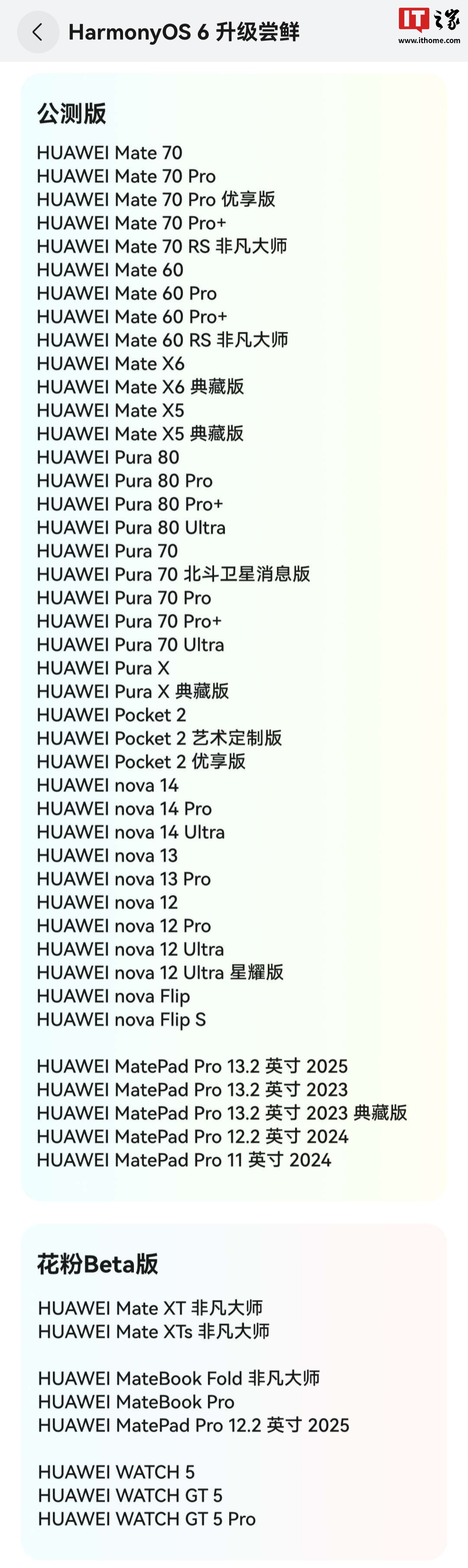 alixixi注意到,华为官方已公布鸿蒙 HarmonyOS 6 公测版手机 / 平板适配机型,名单如下: