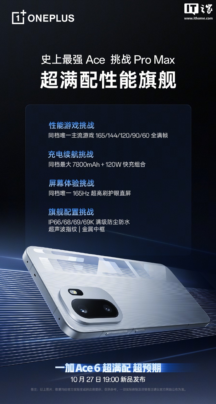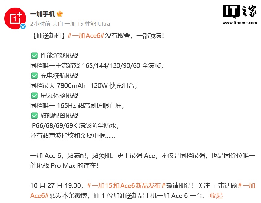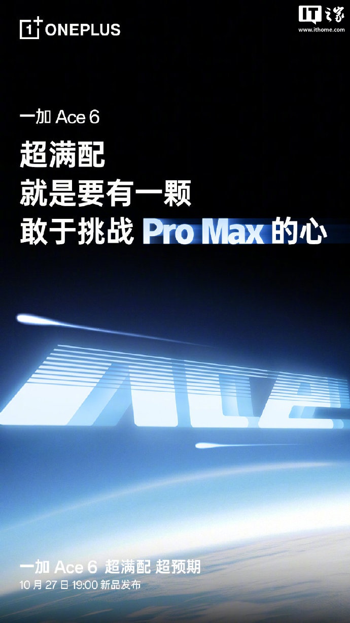 alixixi 10 月 23 日消息,一加官方今天在微博发布预热,宣称 Ace 6 手机将搭载同挡位唯一 165Hz 超高刷护眼直屏,10 月 27 日晚 19 点正式发布。