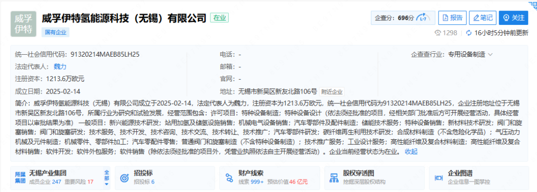 2025年02月14日,威孚伊特氢能源科技(无锡)有限公司成立,注册资本:1213.6万欧元,经营范围包括:新兴能源技术研发;站用加氢及储氢设施销售;机械电气设备销售;汽车零部件及配件制造;储能技术服务;新材料技术研发;汽车零部件研发;碳纤维再生利用技术研发等。该公司由威孚伊特氢能源科技(无锡)有限公司由无锡威孚高科技集团股份有限公司持股51%、Voith HySTech GmBH持股49%。据了解,无锡威孚高科技集团股份有限公司,前身为无锡油泵油嘴厂,始建于1958年,是国内汽车零部件的著名生产厂商,中国汽车零部件五十强企业。由国企无锡产业发展集团有限公司(简称“无锡产业集团”)控股。