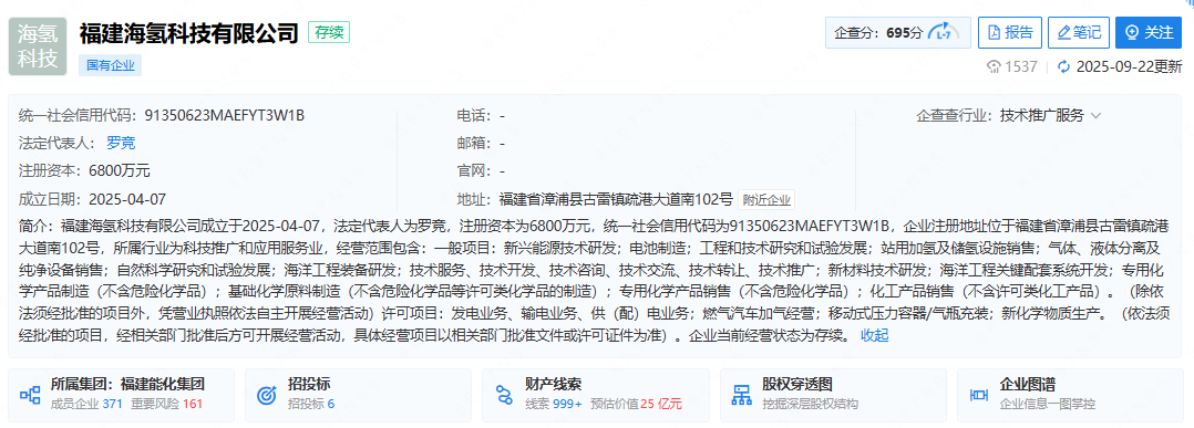 2025年4月7日,福建海氢科技有限公司成立,注册资本6800万元,注册地位于福建省漳浦县古雷镇疏港大道南102号,法定代表人为罗竞。经营范围包括:新兴能源技术研发;站用加氢及储氢设施销售;气体、液体分离及纯净设备销售;新材料技术研发;海洋工程关键配套系统开发;发电业务、输电业务、供(配)电业务;燃气汽车加气经营;移动式压力容器/气瓶充装;新化学物质生产等。该公司由福建省氢能产业发展有限公司(持股55%、为控股股东)、福建省能源石化创新研究院有限责任公司、福建省能化科创股权投资合伙企业(有限合伙)及嘉庚创新实验室共同持股。