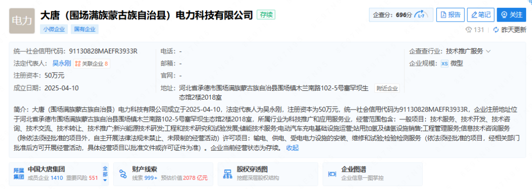 2025年4月10日,大唐(围场满族蒙古族自治县)电力科技有限公司成立,注册资本50万元,注册地位于河北省承德市围场满族蒙古族自治县围场镇木兰南路102-5号塞罕坝生态馆2楼2018室,法定代表人为吴永刚。经营范围包括:新兴能源技术研发;工程和技术研究和试验发展;储能技术服务;电动汽车充电基础设施运营;站用加氢及储氢设施销售;输电、供电、受电电力设施的安装、维修和试验等。该公司由中国大唐集团旗下大唐国际发电股份有限公司100%控股。