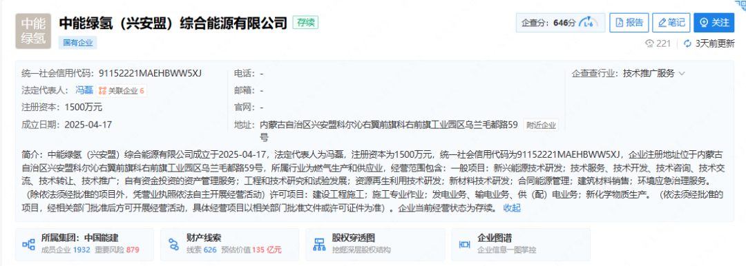 2025年4月17日,中能绿氢(兴安盟)综合能源有限公司成立,注册资本1500万元,注册地位于内蒙古自治区兴安盟科尔沁右翼前旗科右前旗工业园区乌兰毛都路59号,法定代表人为冯磊。经营范围包括:新兴能源技术研发;技术服务、技术开发、技术咨询、技术交流、技术转让、技术推广;工程和技术研究和试验发展;资源再生利用技术研发;新材料技术研发;合同能源管理;发电业务、输电业务、供(配)电业务等。该公司由中国电力工程顾问集团有限公司100%控股,且中国能建为该公司的间接全资控股股东。