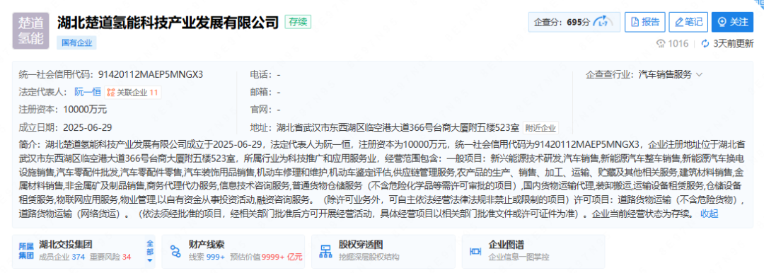 2025年06月29日,湖北楚道氢能科技产业发展有限公司成立于,注册资本10000万元,经营范围包括:新兴能源技术研发,汽车销售,新能源汽车整车销售,新能源汽车换电设施销售,汽车零配件批发,汽车零配件零售,汽车装饰用品销售,机动车修理和维护,机动车鉴定评估,供应链管理服务。该公司由湖北交通投资集团控股(间接持股51.292%)、楚天高速持股30%、武汉临空港产业创新发展公司持股10%。