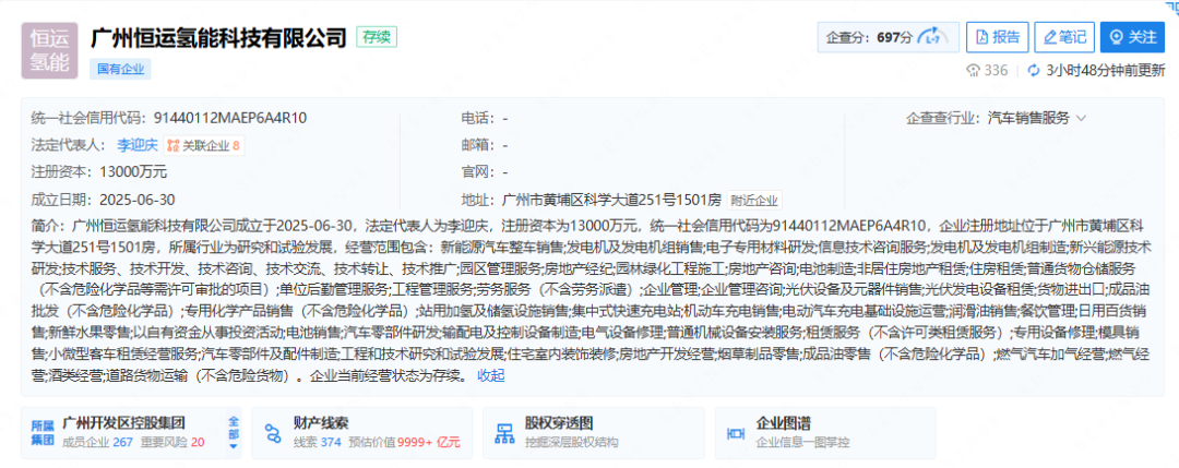 2025年06月30日,广州恒运氢能科技有限公司成立,注册资本13000万元,经营范围包括:新能源汽车整车销售;发电机及发电机组销售;新兴能源技术研发;光伏设备及元器件销售;光伏发电设备租赁;站用加氢及储氢设施销售;集中式快速充电站;机动车充电销售;电动汽车充电基础设施运营;输配电及控制设备制造等。该公司由广州恒运氢能科技有限公司由广州恒运企业集团股份有限公司100%控股。