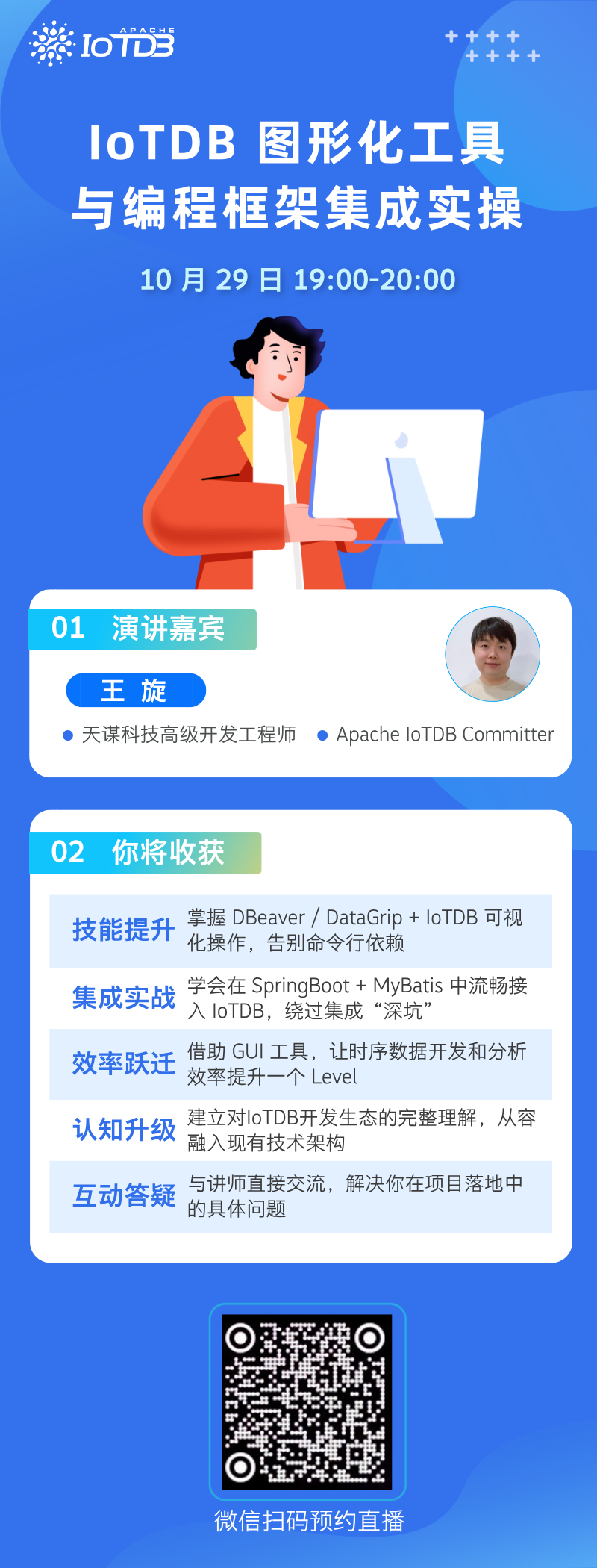 ?10 月 29 日(周三)19:00,我们将通过一场全链路实战演示,带你深入 IoTDB 强大的编程与可视化生态,一次性解决上述所有难题。