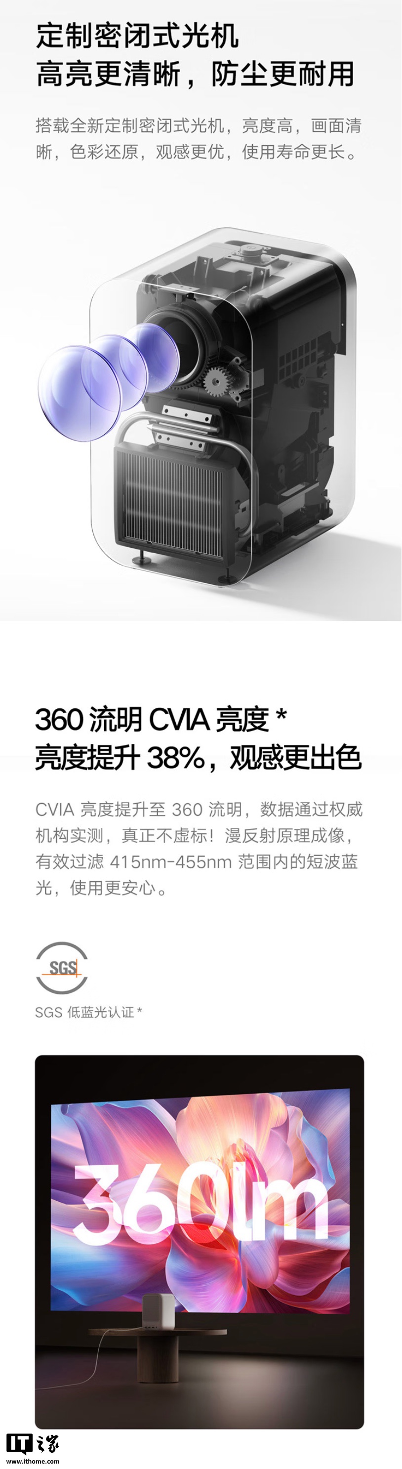 据介绍,这款新品搭载全新定制密闭式光机,CVIA 亮度提升至 360 流明,支持 1080P 物理分辨率。MEMC 运动补偿可通过智能插帧提升投影画面的流畅性、清晰度和细节表现,减少体育比赛等快速运动画面的抖动、拖尾与卡顿。