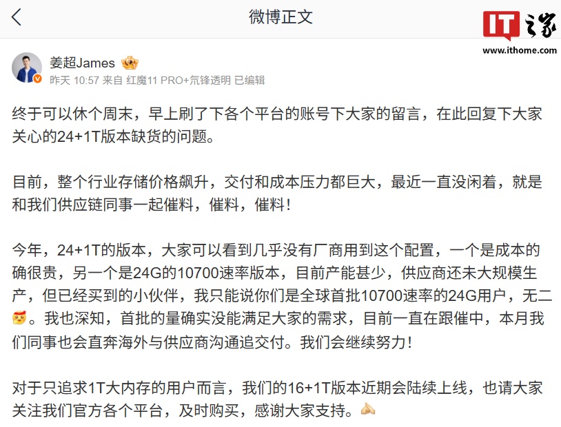 alixixi 10 月 26 日消息,红魔游戏手机产品总经理姜超昨日在微博回复了用户关心的 24GB+1TB 版本缺货问题,并透露今年几乎没有厂商用 24GB+1TB 配置的原因。他称,目前整个行业存储价格飙升,交付和成本压力都巨大,而 24GB+1TB 版本成本的确很贵、且 10700 速率版本目前产能甚少。