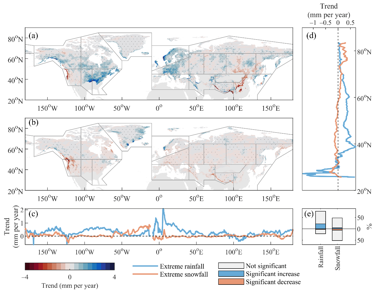 针对这一问题,中国科学院新疆生态与地理研究所陈亚宁研究员团队,利用 1950 年至 2022 年的高分辨率气候再分析数据(ERA5-Land),系统研究了北半球极端降雨和极端降雪的长期变化趋势、对温度的响应以及背后的驱动因素。