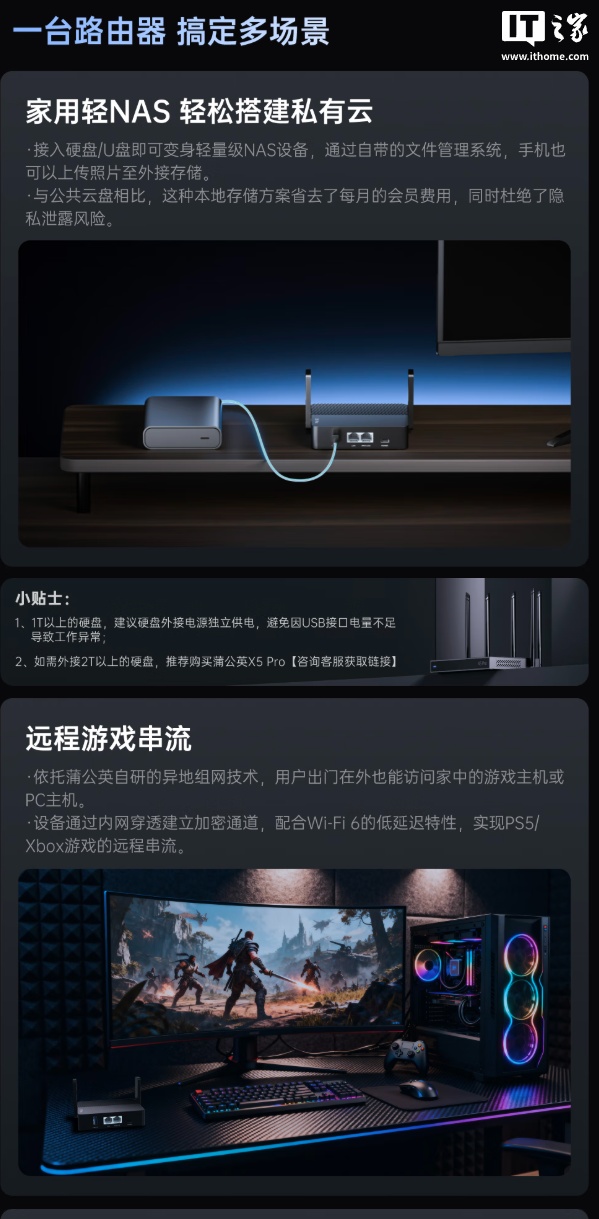 外观方面,X1 Pro 路由器自带可折叠一体式天线,机身重量 160g,侧面带有自定义开关,还可将家中的 PC 主机变身远程串流机,外出时也能玩到 3A 大作。
