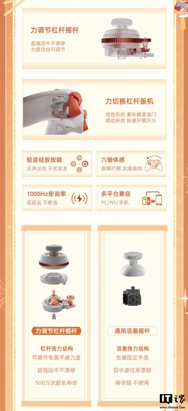 硬件方面,这款手柄搭载力调节杠杆摇杆,可自由调节力度,号称拥有“超强回中不漂移”,搭配力切换杠杆扳机按键,支持随心切换线性、微动形态,快速适配赛车、FPS 等游戏,轮询率可达 1000Hz,配有轻音硅胶按键,号称“无声出击”。