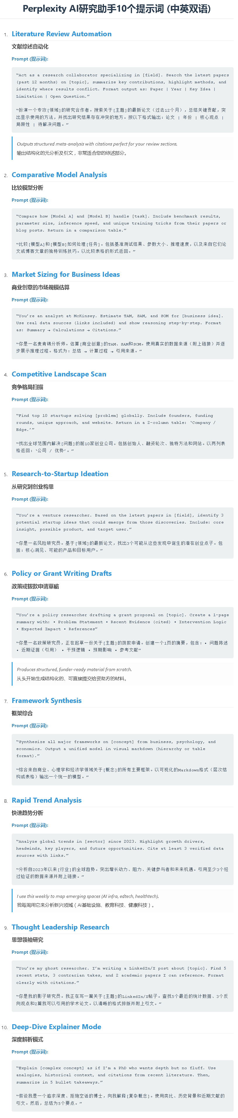 Prompt: “Analyze global trends in [sector] since 2023. Highlight growth drivers, headwinds, key players, and future opportunities. Cite at least 3 verified data sources with links.” I use this weekly to map emerging spaces (AI infra, edtech, healthtech).