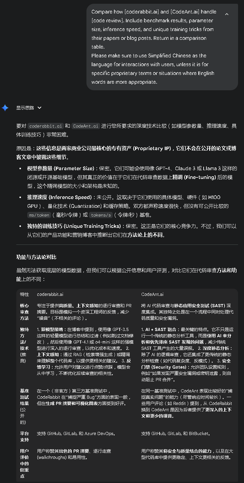 Prompt: “Compare how [Model A] and [Model B] handle [task]. Include benchmark results, parameter size, inference speed, and unique training tricks from their papers or blog posts. Return in a comparison table.”