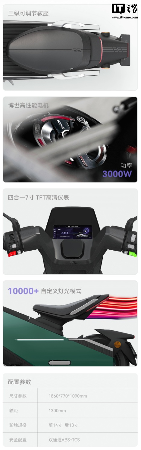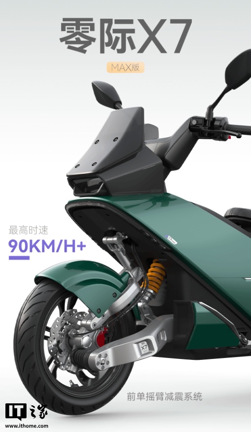 零际 X7 配有博世 3000W 电机,最高时速可达 90km;搭载四合一 7 英寸 TFT 仪表屏,前单摇臂减震系统,还有双通道 ABS + TCS。