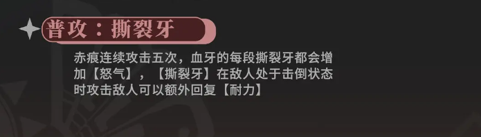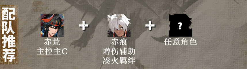 在战斗里面,如果大家掌握了赤痕的各种技能,其实在使用机制上面,只要把握好时机,就可以对一些高韧性的敌人带来足够的击败效果,在阵容搭配上面,如果大家玩赤痕的话,这里建议是跟同属性的赤荒一起搭配,这两个角色目前的搭配都是属于火系里面比较经典的搭配,一个负责主要控制跟主要输出,而赤痕在这里负责的是真伤辅助,然后他们俩放在一起,还有回去的羁绊可以触发,那么后期在加成上面就有20%的输出加成,整体来说后期他俩带来的爆发输出伤害还是较高的,而且可以通过觉醒类型的技能来解锁他的突刺动作,这样在后期他的状态层数叠加起来之后,整体的战斗数值绝对不会很低。