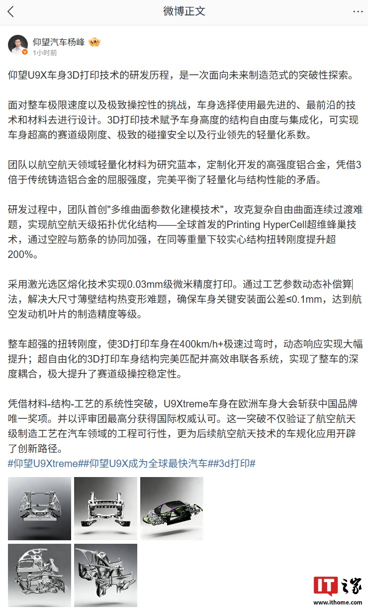 alixixi注意到,比亚迪汽车工程研究院仰望研究院院长杨峰今日发布长文,介绍了仰望 U9X 车身 3D 打印技术的研发历程,并直言这是一次面向未来制造范式的突破性探索。